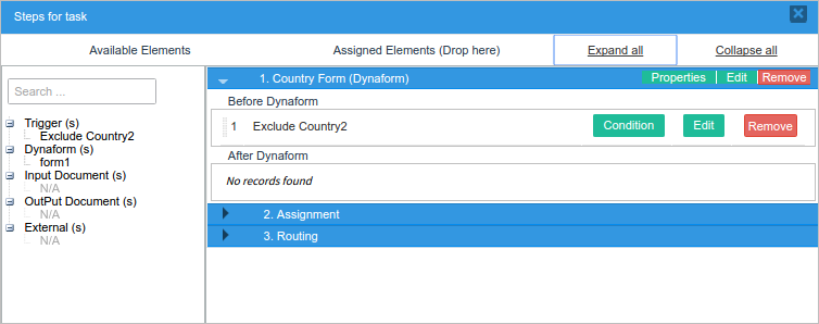 - Assign d1, d4 and d3 to the Task2 steps. Assign the Assign value trigger before the d4 Dynaform.