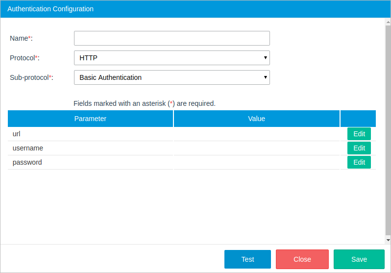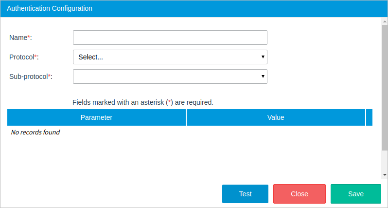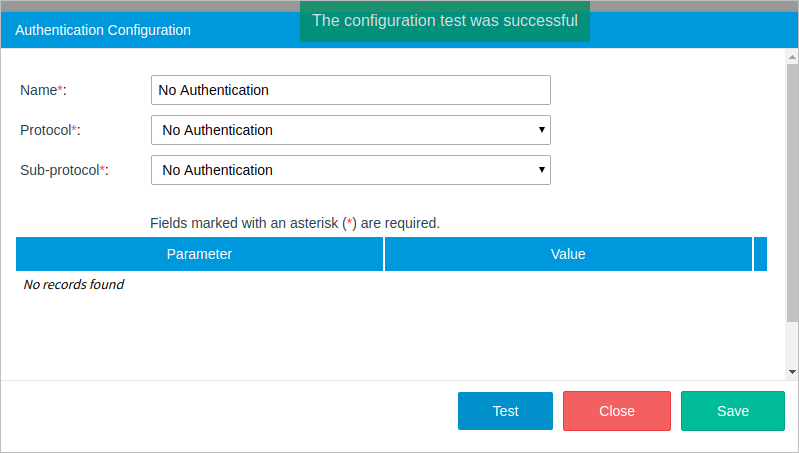 After the sub-protocol configuration is set, click on Test to confirm that the information is correct. If the credentials given were correct, a green message will be displayed at the top of the window dialog as shown in the image below. Save the configuration by clicking the Save button.