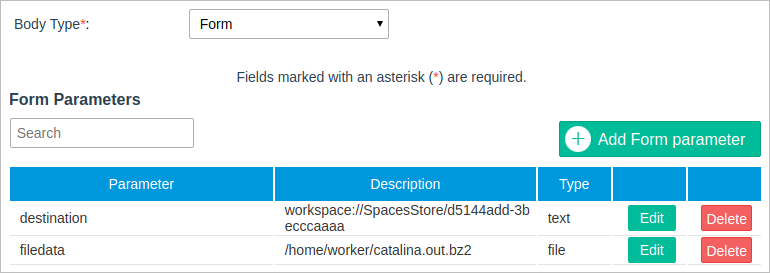 - Form: Select this option if the data in the request body needs to be sent encoded as form-data. This option is useful for sending files as part of the request. If this option is selected, the following section will be displayed: