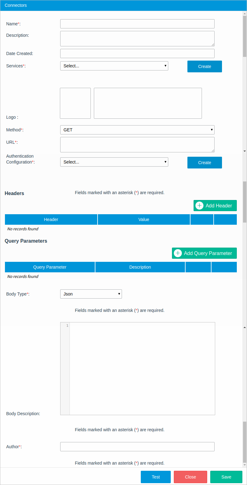- Request Body: Introduce a request body in JSON format. This field is available only if the connector body type was set to "Json".