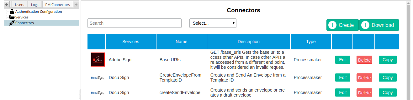The connectors section displays a list of all the connectors available in the current ProcessMaker instance. This section contains a connector wizard to create almost any kind of request quickly, along with a download button to access the Connectors Library.