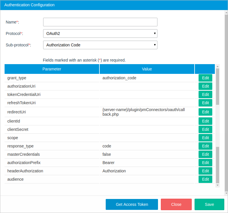 - authorizationUri: The Authorization URL of the API Service Provider where ProcessMaker will make the request to obtain an authorization code.