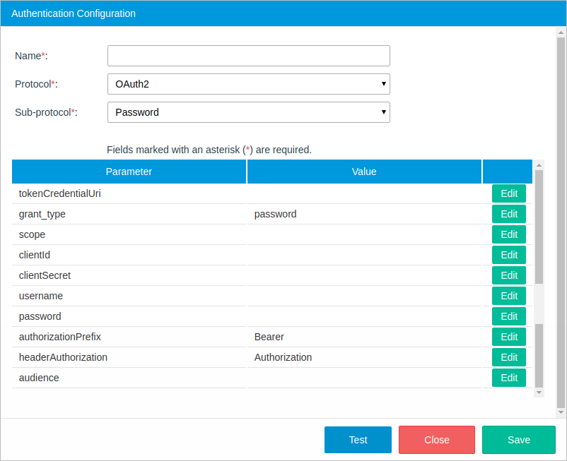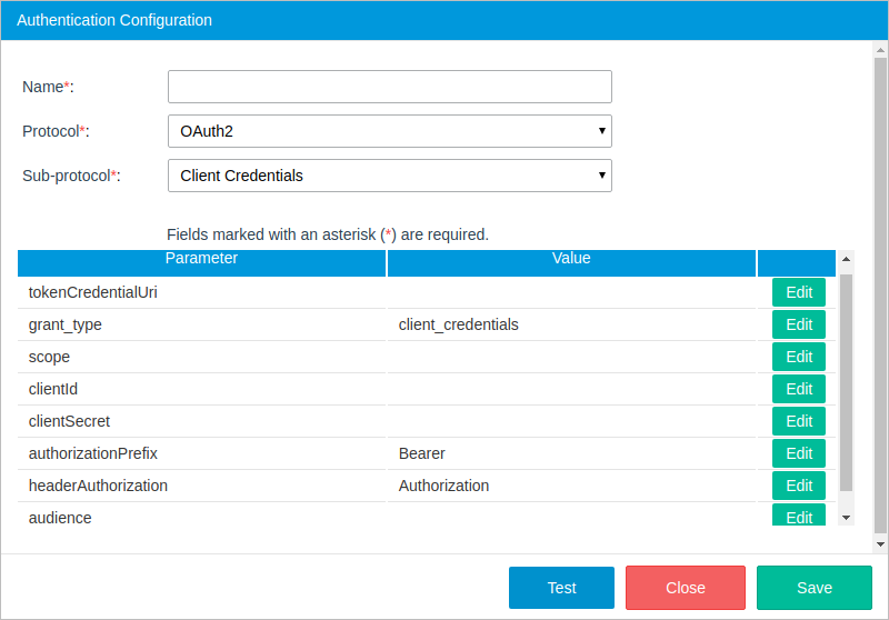 - authorizationPrefix: The token type that will be used in the authorization header, which is set to "Bearer" by default in sub-protocols that use OAuth2, but can be edited depending on the web service.