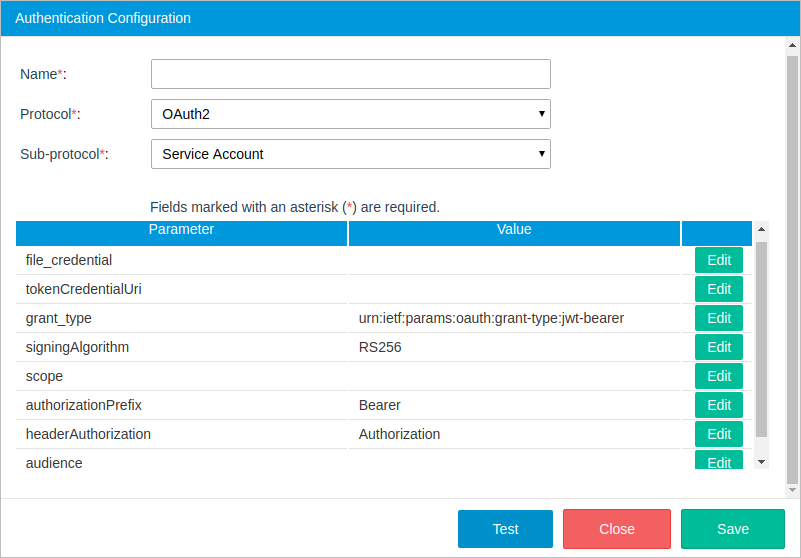 urn:ietf:params:oauth:grant-type:jwt-bearerby default. - signingAlgorithm: RS256. Service accounts rely on the RSA SHA-256 algorithm.