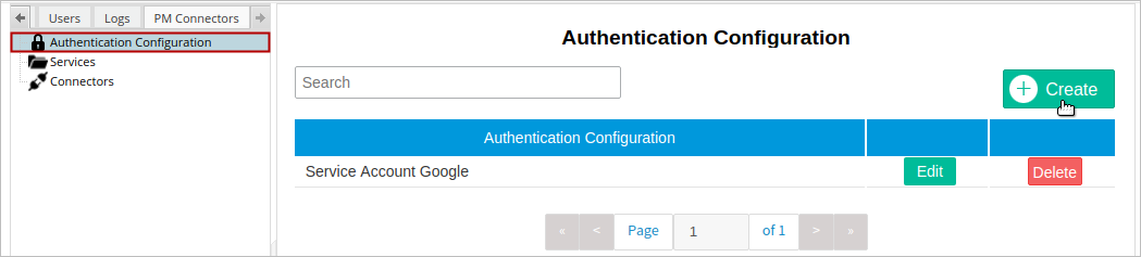 To create a new authentication configuration, click the Create button at the top-right of the section.