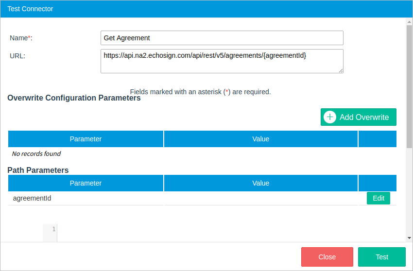 - Path Parameters: Fill out the path parameters configured in the connector configuration. These are the method parameters included between