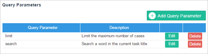 Query Parameters: (Optional) Query parameters and their description. A query parameter is a method parameter not included in the URL path property to narrow the request response. They are separated from the URL path by the question mark (?).