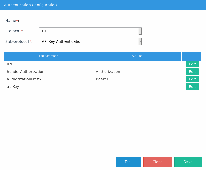 - authorizationPrefix: The token type that will be used in the authorization header, which is set to Bearer by default but can be edited depending on the web service. apiKey: A unique API key.