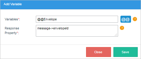- Response Variable: Define an object variable to store the result of the request by clicking the @@ button and selecting the object variable. The result object usually returns a status and a message serialized in JSON, but it is recommended to inspect the content-type of the requested service to find out what kind of data is returned.