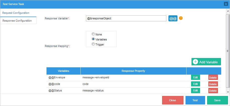 After the variables and mapped objects are defined, the response configuration will look like the image below.