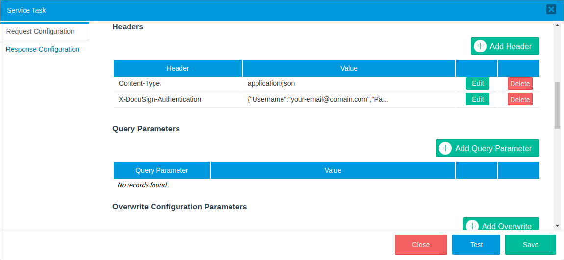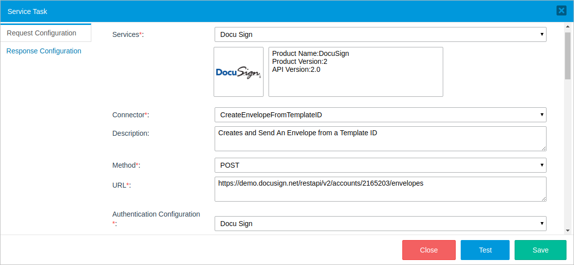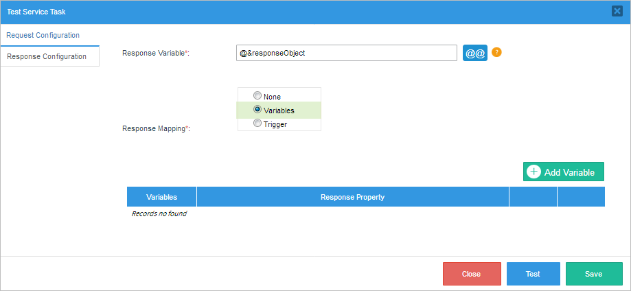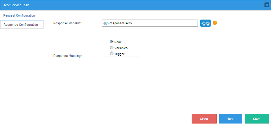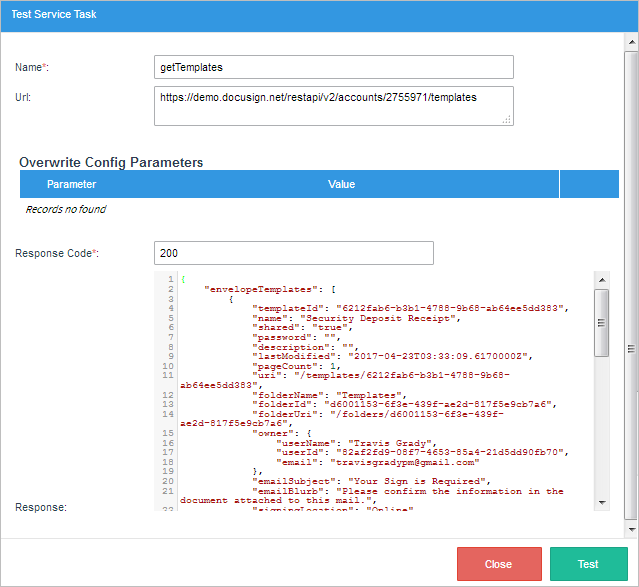After the service task is configured, click on the Test button at the end of the window to see if the configuration is set correctly before saving it. If the None or Trigger option was selected in the Response Mapping section, the following window will be displayed:
