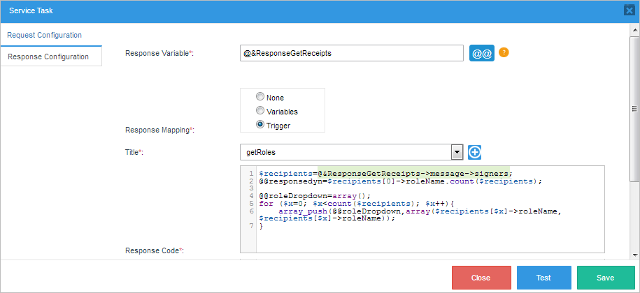 Select a trigger in the Title dropdown. The PHP code of the trigger will be displayed in the Response Code textarea. To make the code easier to read and to help eliminate careless errors, the code editor contains syntax highlighting, parentheses, bracket matching and line numbering.