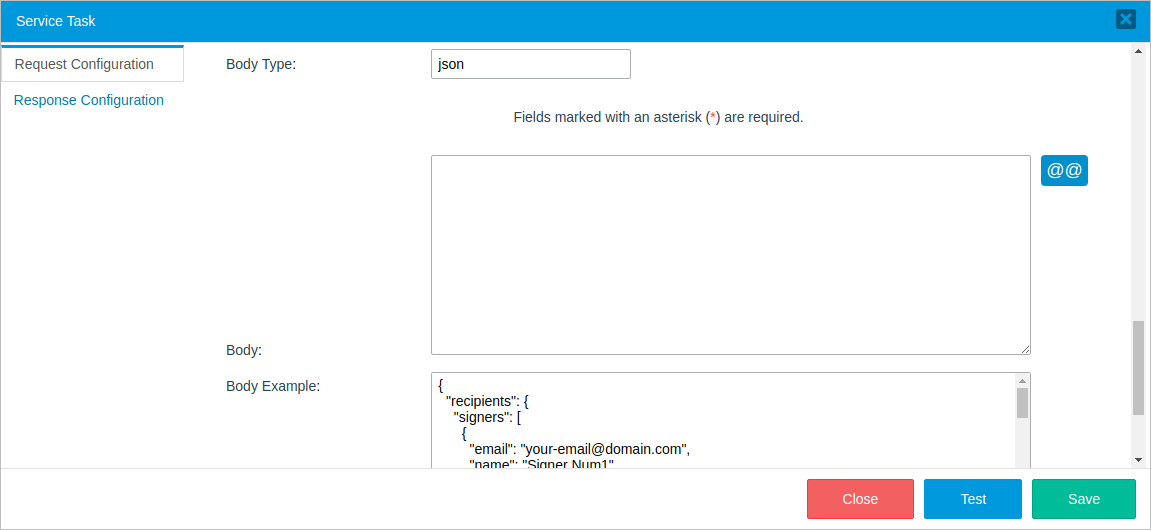 - Body: Introduces a request body in JSON format. This field is available only if the connector body type was set to "Json". ProcessMaker variables can be used in this request body.