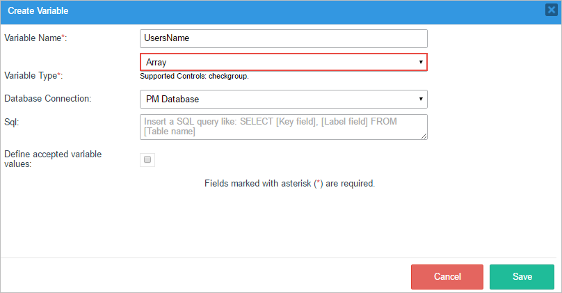 Create a new Dynaform and add a dropdown control to display the names of the users. In the Create / Select Variable dialog, create a different variable.