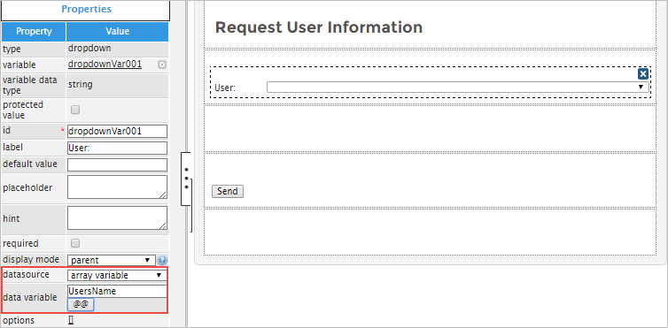 Click on the dropdown control to modify its Datasource property and select the Array variable. Then, click on the @@ button and select the UsersName array variable.