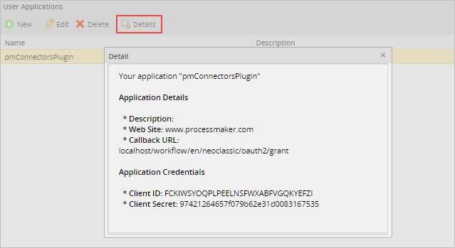 Select the pmConnectorsPlugin application from the list and click on Details to review the application credentials. Copy the Client ID and Client secret, which will be used by the external application to obtain authorization.