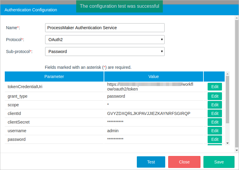 After ready, click on Test. If everything is set up properly, a green message will be displayed at the top of the window dialog. Finally, click the Save button.