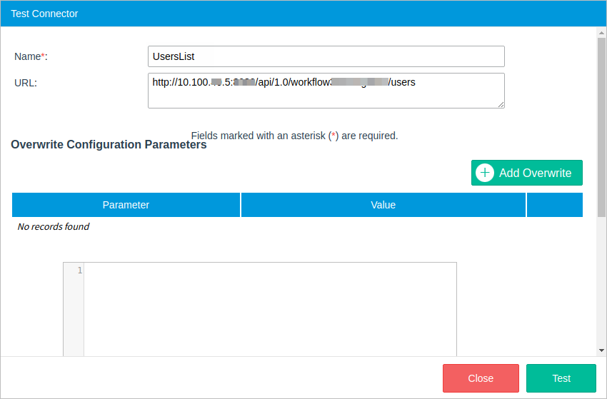 Click on the Test button to open the Test Connector dialog. Then click the Test button.