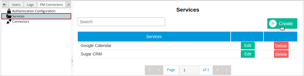 After that, select the Services option under the PM Connectors tab, and click on Create to create a new service.