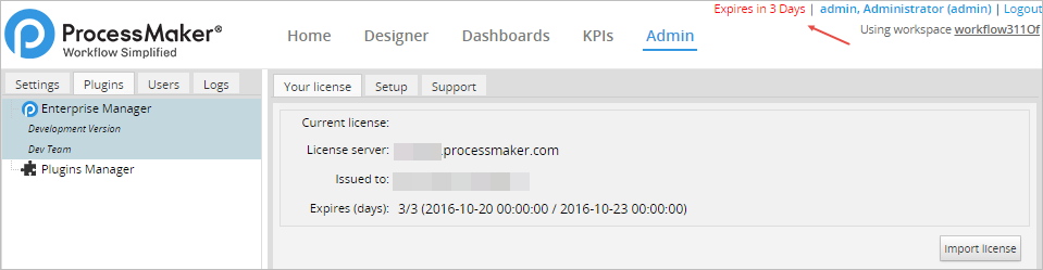 If your license expires, please renew it by contacting the ProcessMaker Sales Department.