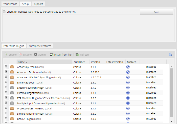 ProcessMaker can be configured to automatically check for updated versions of plugins and features as they become available. To enable this option, go to ADMIN > Plugins > Enterprise Manager > Setup and mark the Check for updates option. Remember that the ProcessMaker server must have an internet connection to check for updates.