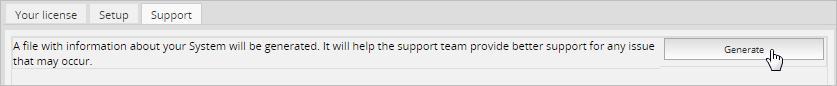 The Enterprise Manager provides an option to generate a file providing information about your system, which can be sent to the ProcessMaker Support Team to check for issues related to the license, plugins and/or features. To create this file, go to ADMIN > Plugins > Enterprise Manager > Support and click on the Generate button to download the file to your computer.