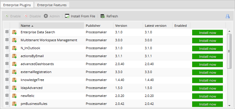 To see a list of all the available plugins, go to ADMIN > Plugins > Enterprise Manager > Enterprise Plugins. The name, publisher, installed version, most recent version and status of each plugin will be displayed.