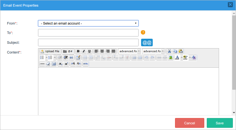 - Content: Required Field. The body of the email that contains the details of the email. Press CTRL + @ to display the list of available variables in the process.