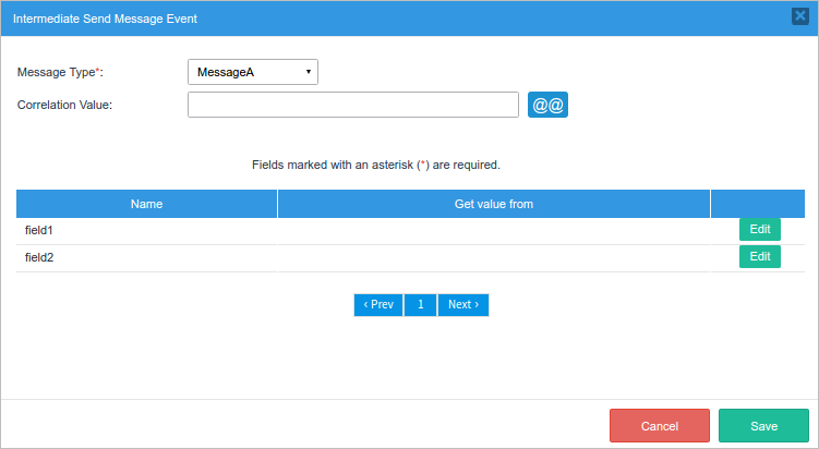 - Get Value From: In this column, define the variables used in the process where the values will be obtained and used by the message that will be sent to the other process.