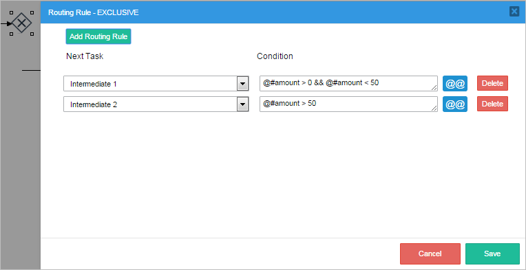 • If the amount is greater than $2000 and less than or equal to $3000, then the Supervisor will review the case. The condition in the routing rule will be: @#amount > 2000 && @#amount <= 3000.