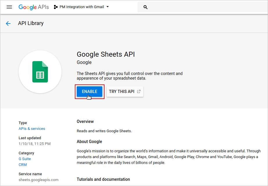 - Click the Google Sheets API icon or link Google Sheets API to enable the Google Sheets API.