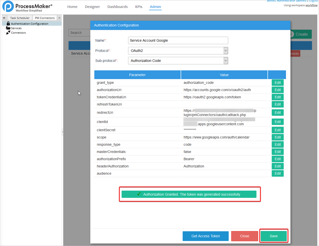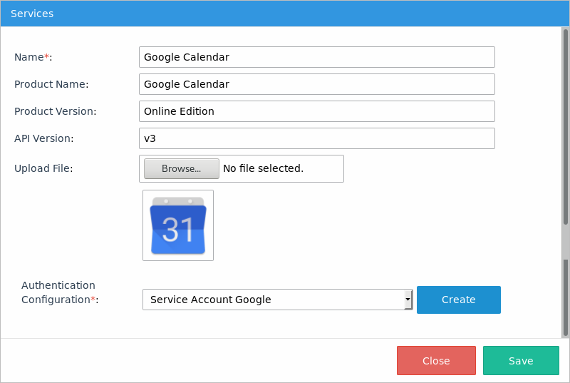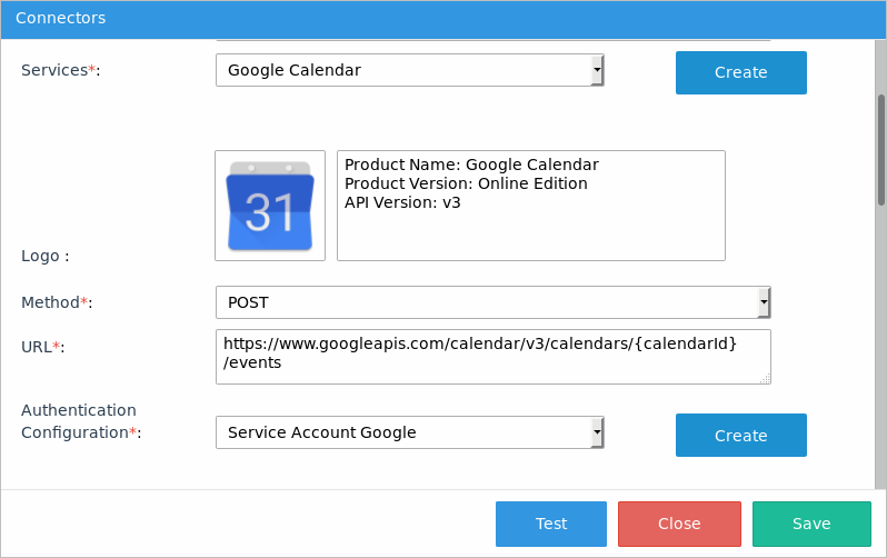 The Connectors screen displays. In the Services drop-down, ensure that the Google Calendar service is selected. In the Authentication Configuration drop-down menu, ensure that the Service Account Google is selected. Modify all the necessary parameters and finally click Save.