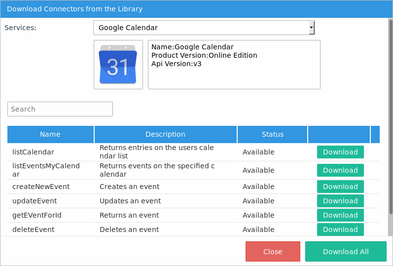 All the available connectors for the Google Calendar display in the same screen. Download all the connectors by clicking the Download All button located at the bottom right of the screen.