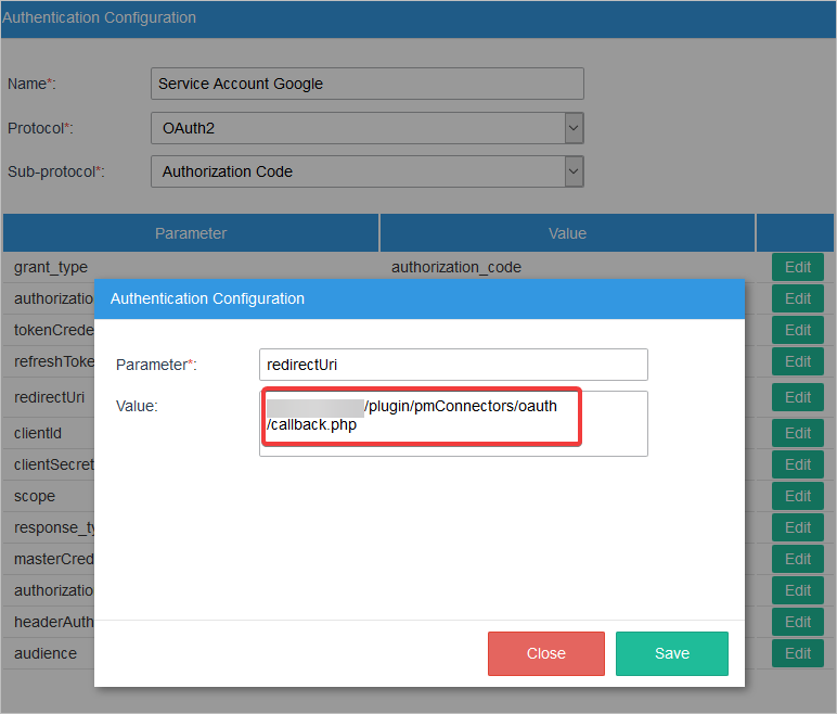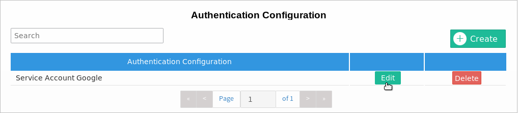 The Authentication Configuration screen displays. In the Service Account Google row, click Edit to open the authentication configuration.