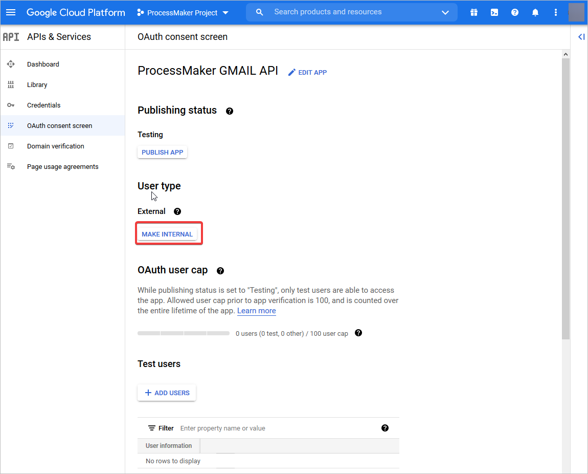 Click OAuth Consent Screen, and the click MAKE INTERNAL in the User type section.