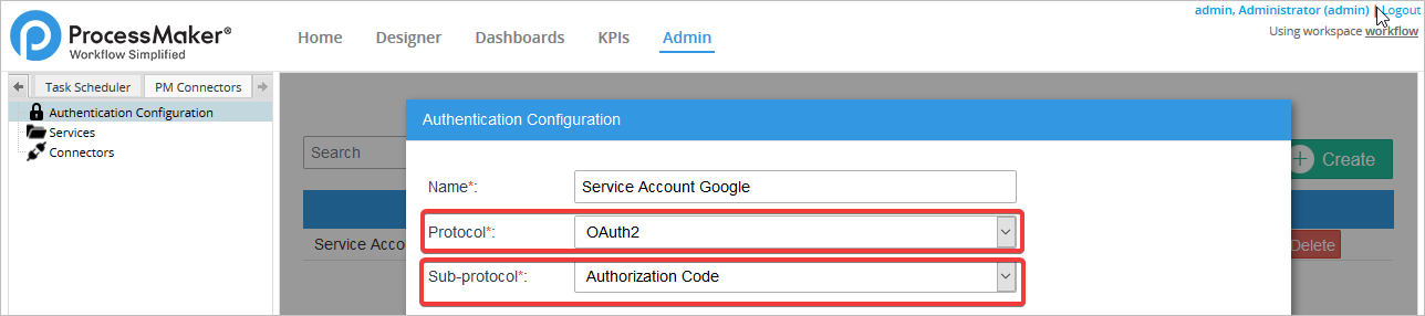 from ProcessMaker configuration, follow these instructions:- Go to Admin > PM Connectors > Authentication Configuration menu.