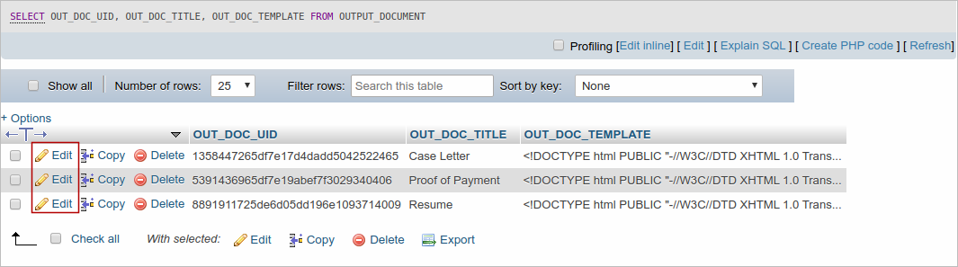 First, create an output document in the process and get its ID number, which in this example is "233815488585c62af61e2a6077136729".