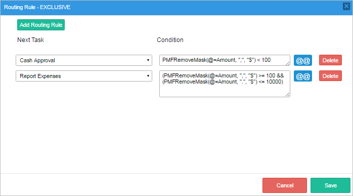 Depending on the value introduced in a field, the following condition is used to decide whether the workflow moves to subsequent task(s):