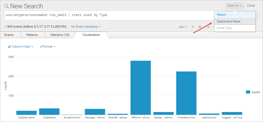 In the Save as Dashboard Panel window, define a new dashboard to save the panel to or select an existing panel. In this example, create a new panel named "Events by Type".