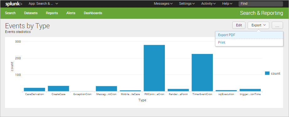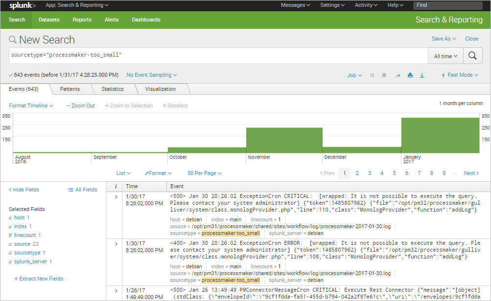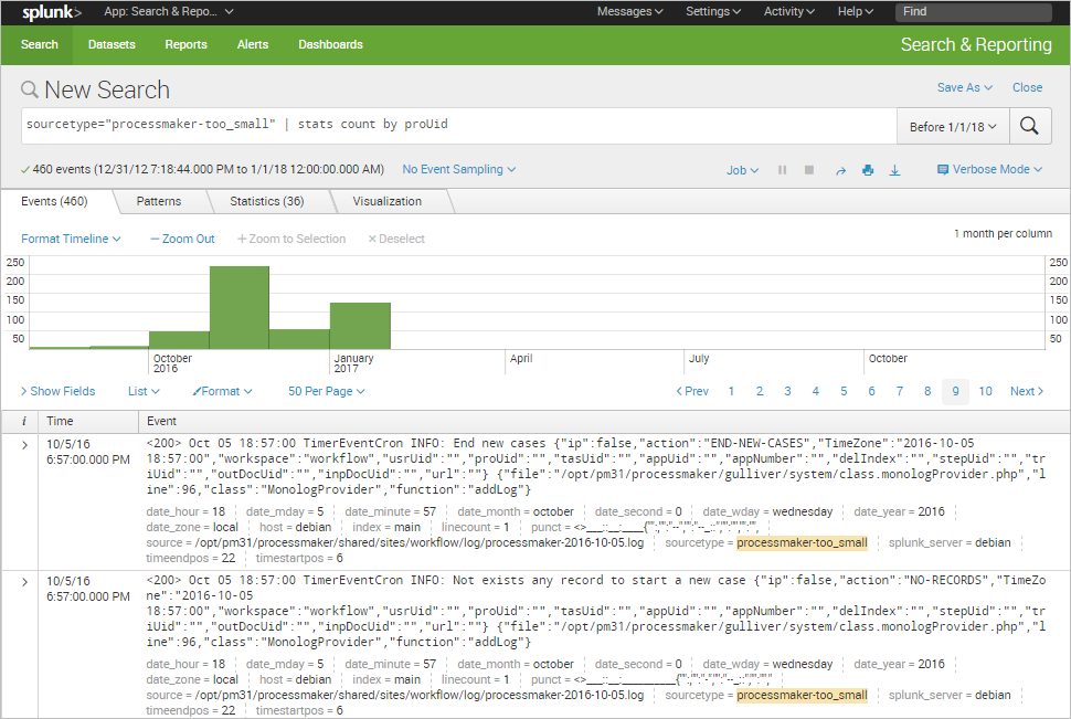 The Splunk Search View lets the user search for specific information stored in the ProcessMaker logs by defining a search criteria.