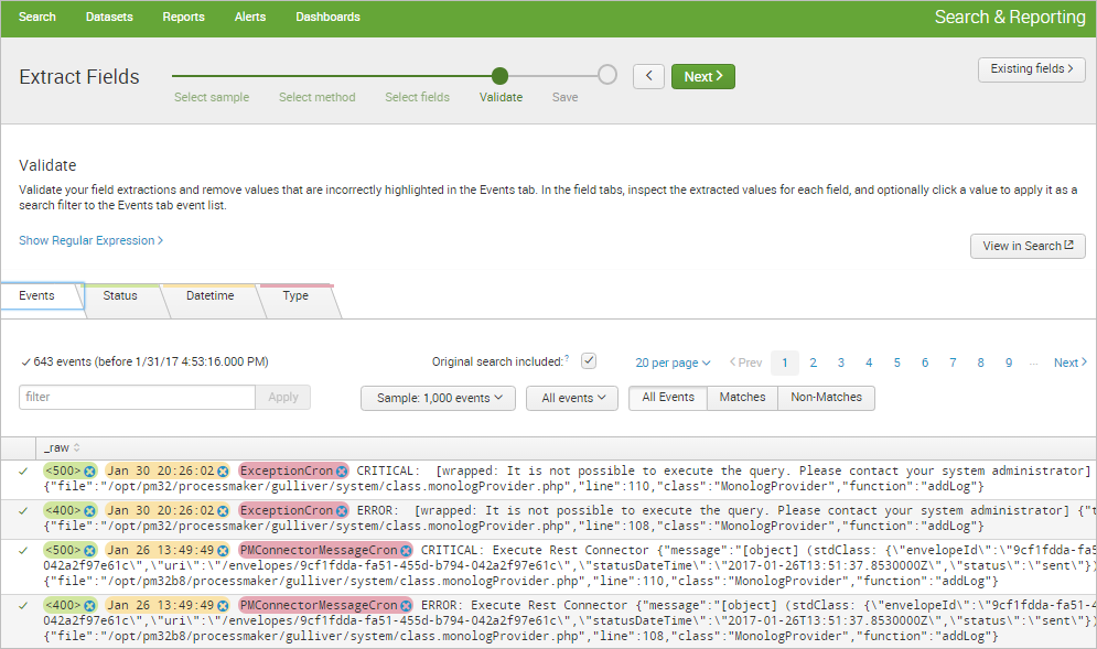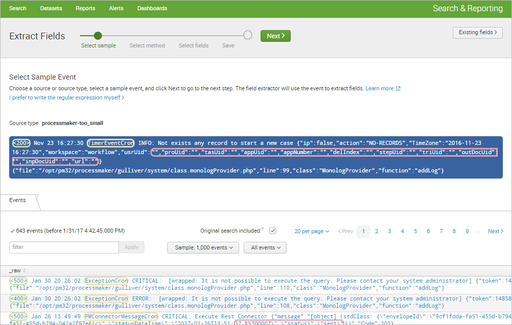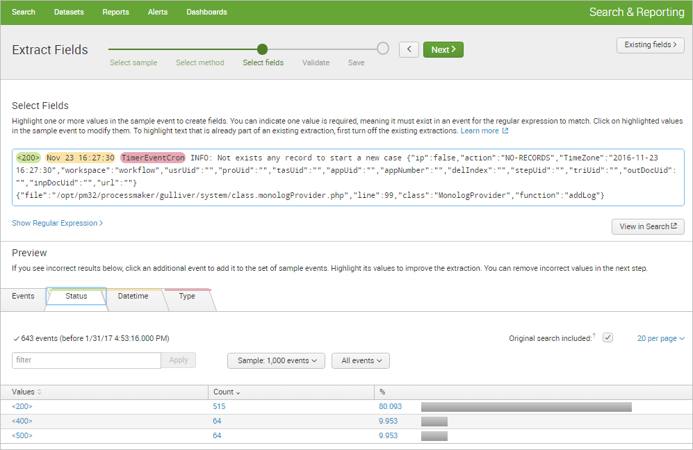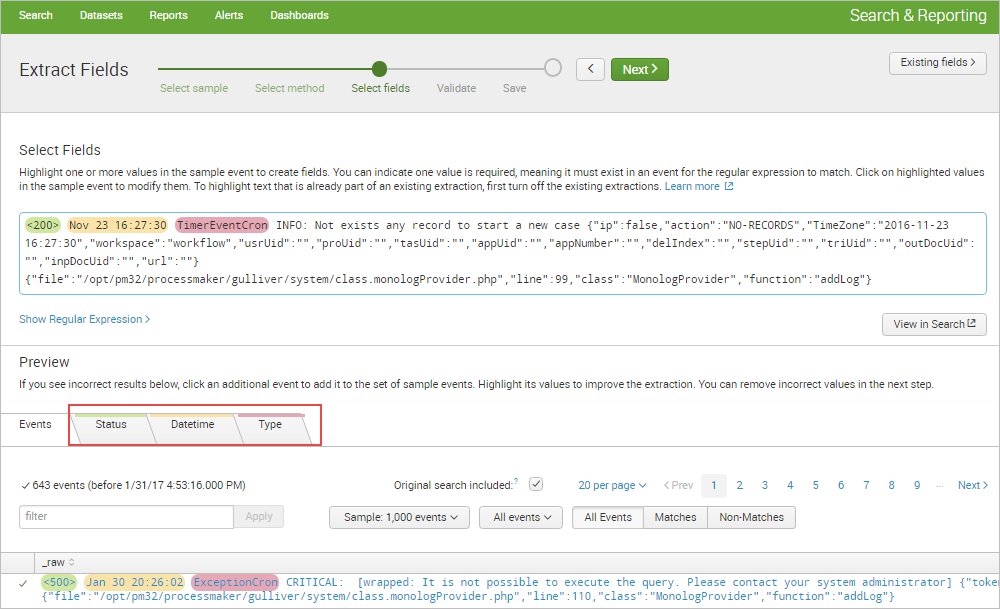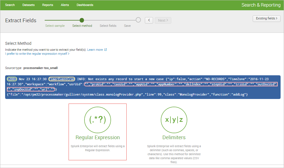 In the next part, select the method to extract the field(s). Since the ProcessMaker log structure consist of three basic parts, but the rest of the log message depends on the event type, extract the Status, Datetime and Type of event. Click on Regular Expression to begin.