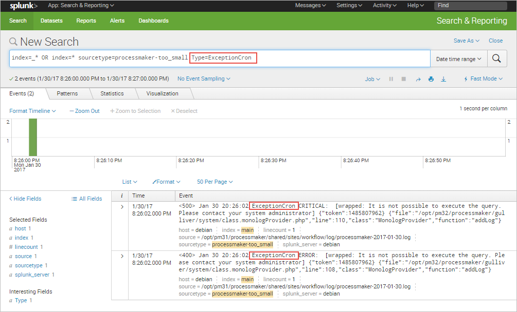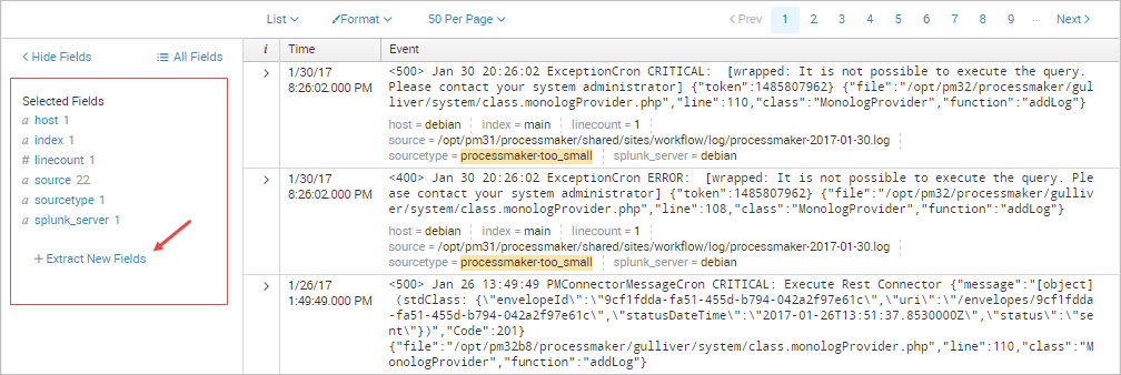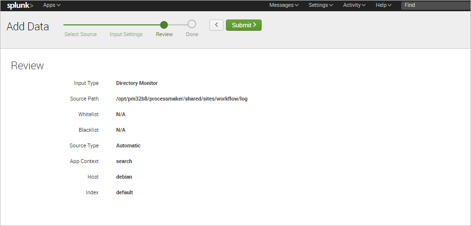 Splunk Enterprise comes with a large number of predefined source types, and attempts to assign the correct source type to the ProcessMaker logs based on their format. In some cases, it might be neccessary to manually select a different predefined source type to the data.