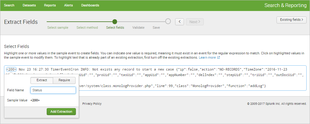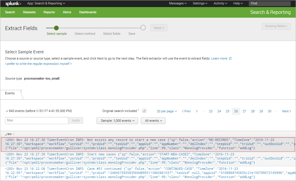 The Extract Fields wizard will be displayed. In the first part, click on the sample event from the list that has the field or fields that you want to extract.