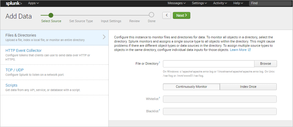 The Add Data step will show three options to receive the data in: Upload, Monitor, or Forward. In this example, the Monitor option is selected to monitor the ProcessMaker Log folder.