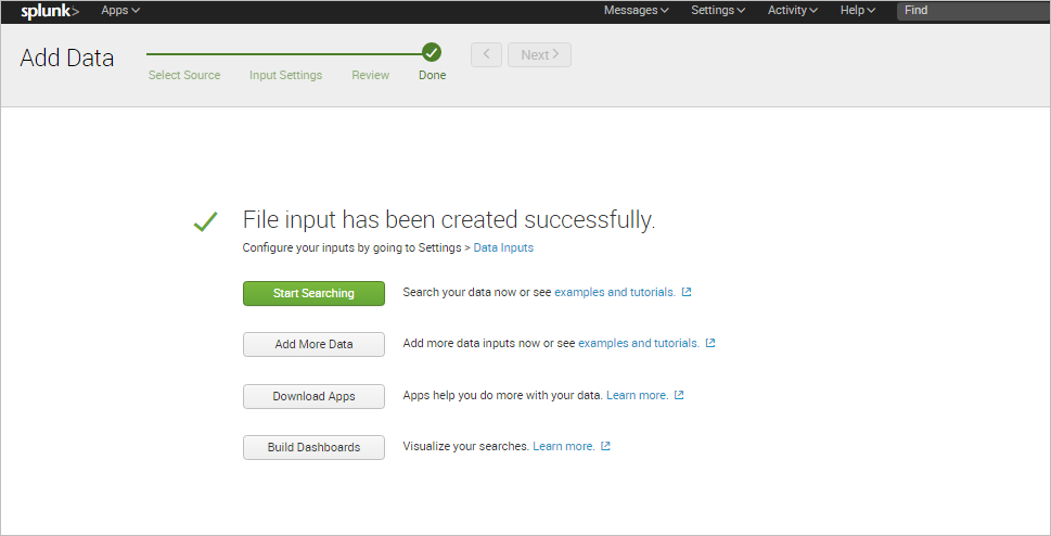 Once Splunk has been installed, the Splunk Wizard is displayed. Since the ProcessMaker Log location needs to be added, click the Add data option.