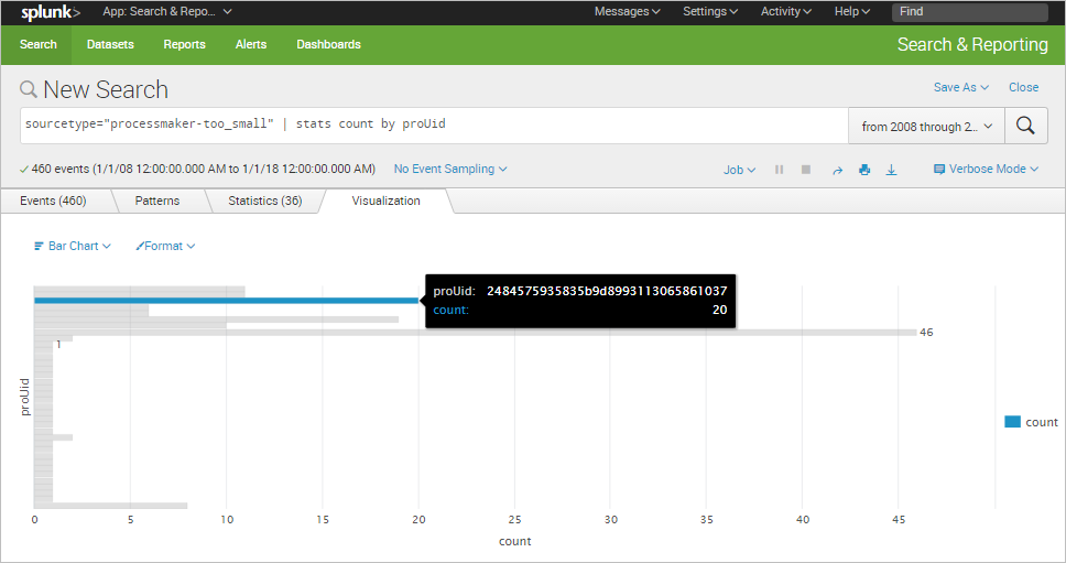 Each data search can be turned into a chart by clicking the Visualization tab. The following chart shown below corresponds to the previous example that filters the records by process UID.