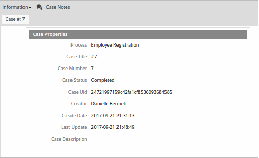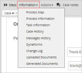 - Information: Lists all the information a supervisor has access to, like information about the process map, process, task, case history, message history, Dynaforms, change log, uploaded and generated documents. See the case information page for more details about each option.