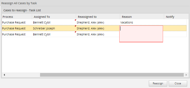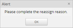 Double-click the Reason column to enter the reason why the case(s) is being reassigned. It is required to enter a reason why the case(s) is being reassigned. If text is not entered into the Reason column, an alert message displays.