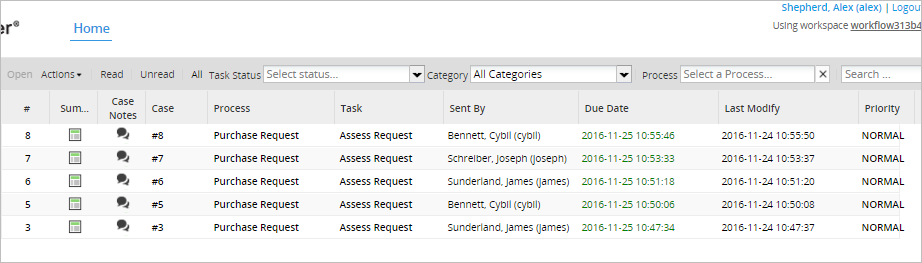 Once logged in as "Shepherd, Alex (alex)", the reassigned cases display in the inbox.