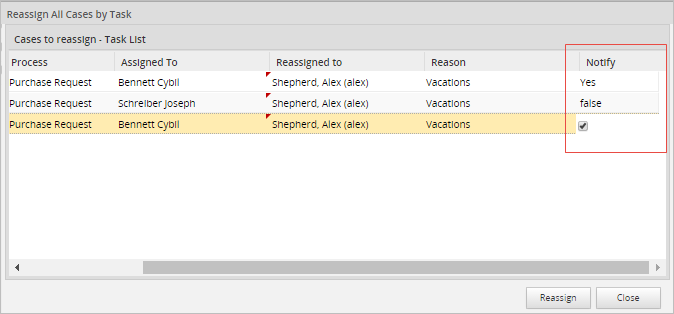Double click the Notify column to display the checkbox to notify the assigned users. Note that each case has its own check box.